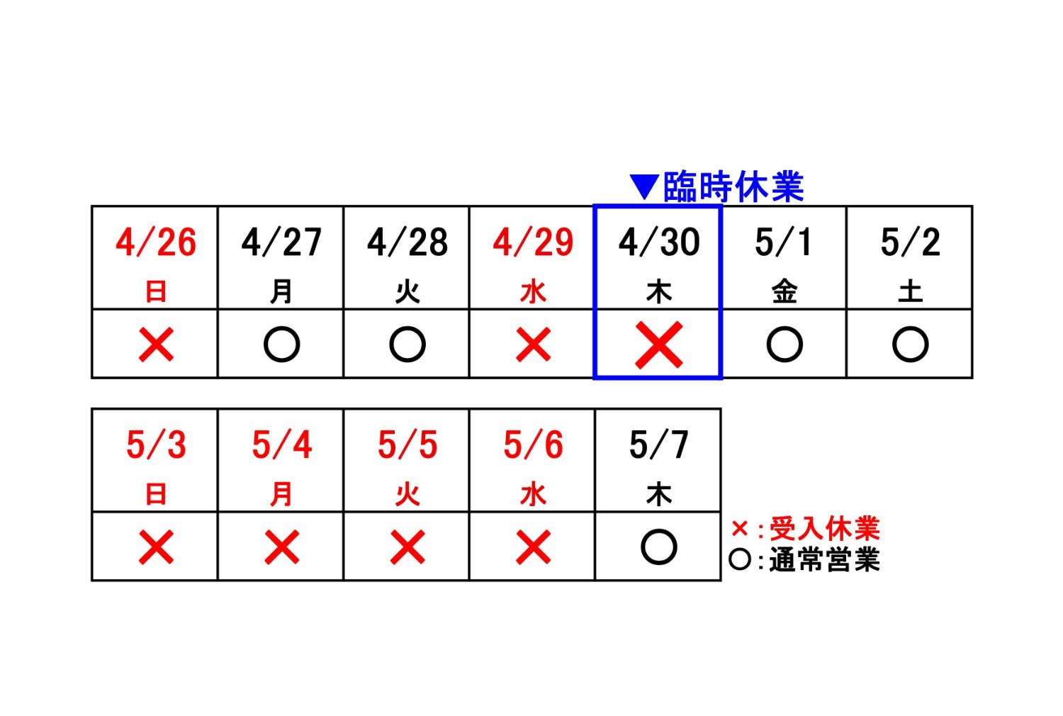 リサイクルプラントは、ゴールデンウィーク期間中、右記のようにお休みさせていただきます。ご不便をおかけいたしますが、宜しくお願いいたします。